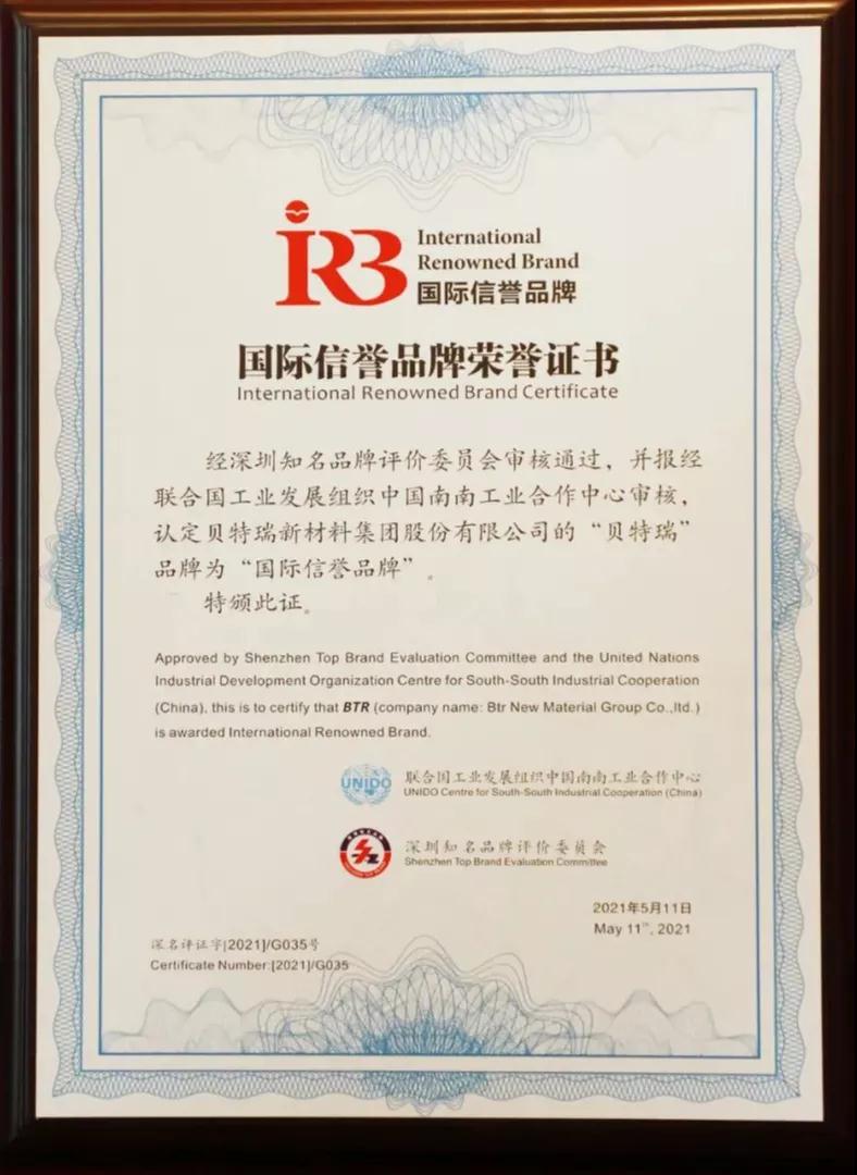 贝特瑞荣获第七届“国际信誉品牌”称号