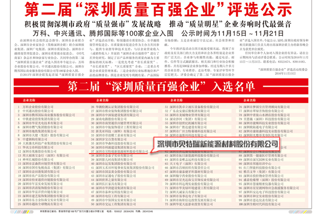 这是贝特瑞公司首次参评“深圳质量百强企业”,成功入围并位列前茅,这不仅是对贝特瑞质量管理体系的的认可,也是对贝特瑞公司整体实力和行业地位的肯定。